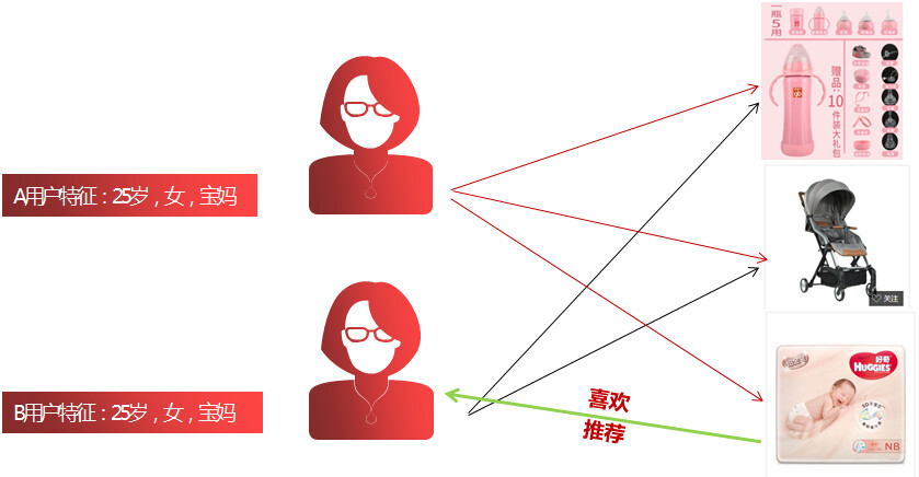 用户画像的千人千面,可以理解为对某一类人进行个性化展示。比如一个宝妈浏览或者购买过奶瓶、婴儿车以及纸尿片,另一个宝妈浏览或者购买过奶瓶、婴儿车,那尿片则会个性化展示给这个宝妈。