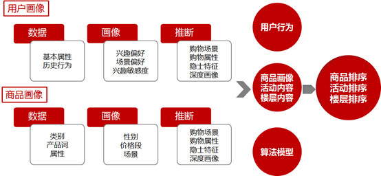 千人千面个性化的最终呈现,是用户画像及商品画像相互匹配的结果。千人千面通过算法模型,对用户画像及商品画像进行分析,最终实现商品、活动楼层的展现及排序。