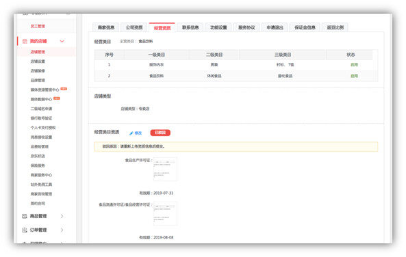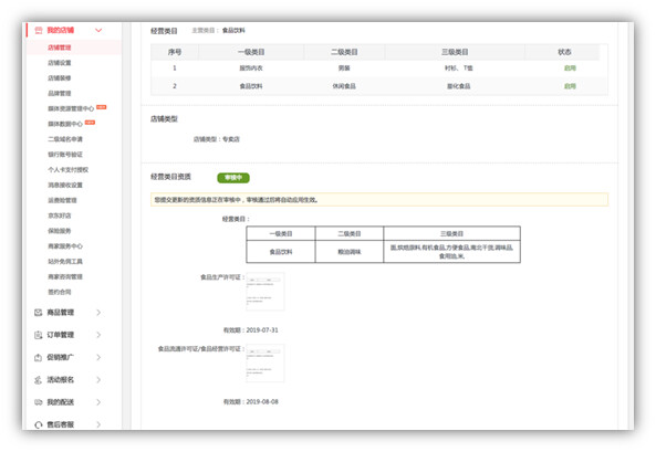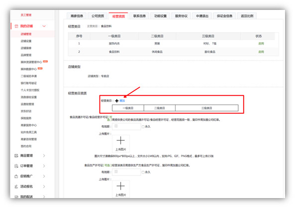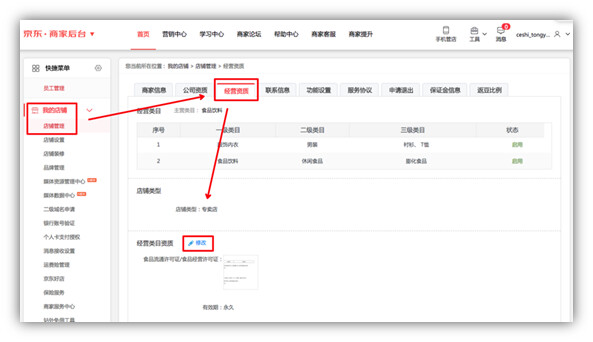 1 登录商家后台shop.jd.com访问“我的店铺→店铺管理→经营资质”,可点击“修改”进行更新行业资质、添加类目。