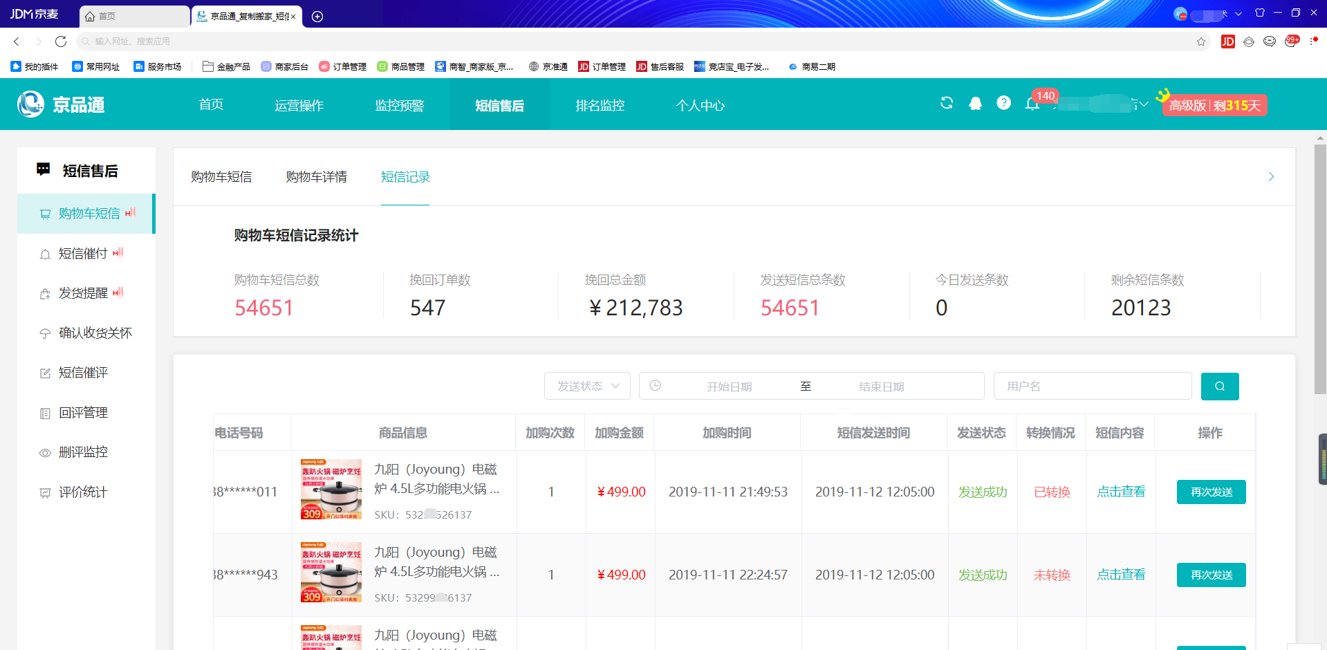 操作方式大家比较熟悉了就是选择类似京品通这样带有购物车短信功能的软件,创建短信模板,自动为加购用户发送短信,并且实时监控转化效果。如图: