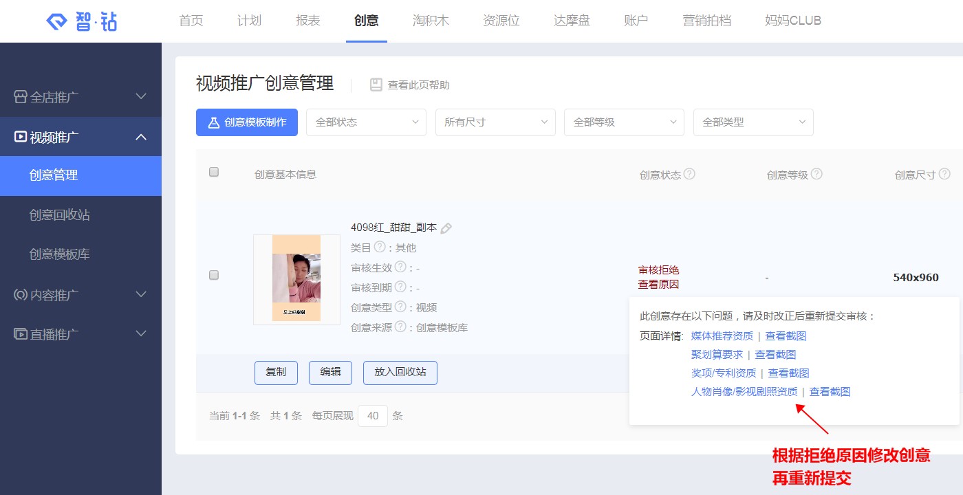 以上全部设置都完成以后,点击【提交创意】,即可在【创意】--【视频创意】--【创意管理】里面看到这个创意。小二会在1-2个工作日完成审核(周末、法定节假日不审核)。
