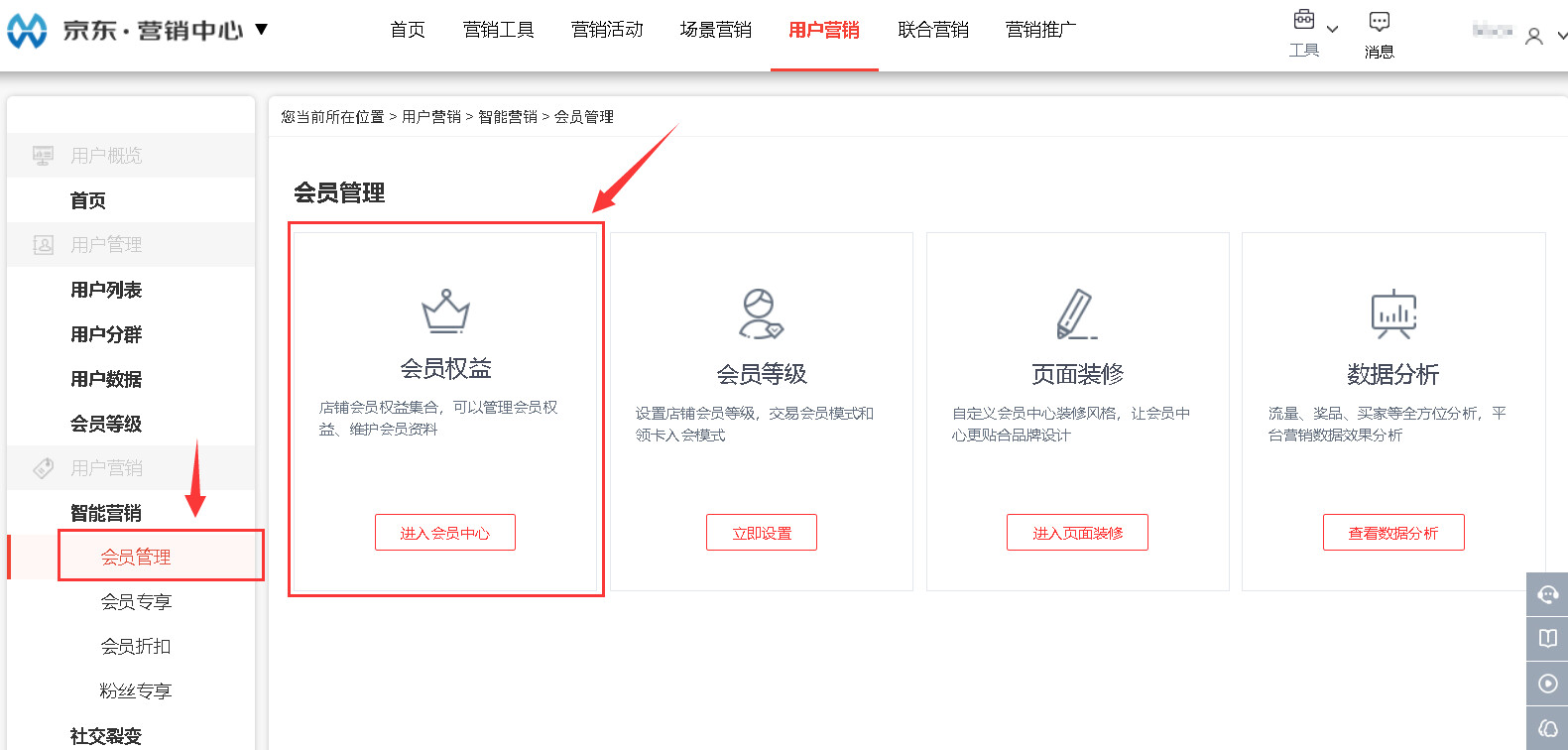 首先进入到会员管理菜单内的会员权益,就会看到开卡礼包与会员优惠券两个功能。