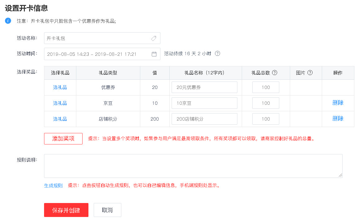 奖品可创建 1-3个,包含京豆、店铺积分、优惠券等,需注意优惠券只能存在一个作为礼品(如开卡礼包已存在一张京券,则无法再添加其他京券或东券作为奖品)