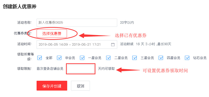 需完善信息包括:活动名称、优惠券种类、活动时间、优惠券领取等级限制、优惠券领取时间。