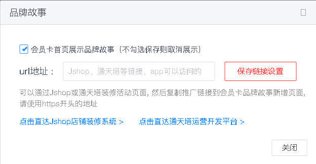 品牌故事:会员中心底部菜单增加品牌故事,可通过通天塔搭建品牌故事页面将其投放至会员中心,如不需要可不开启。