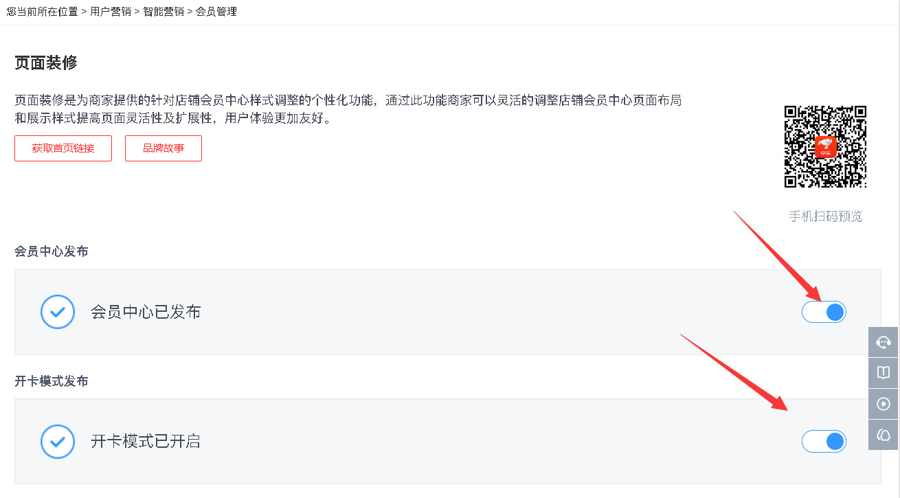 勾选按钮可选择开启开卡模式,会员中心发布则展示在京东APP店铺首页的右下角菜单栏。