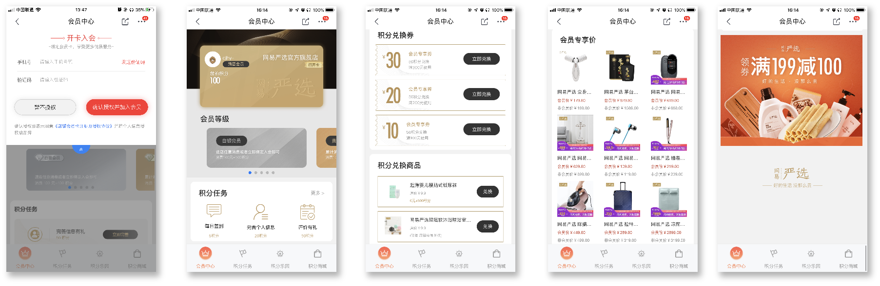 优先选择会员卡样式,当然这里的会员卡支持自定义上传个性化的卡片样式,权益部分为会员对应等级权益,同时主页还可添加积分加钱购,会员专享价,积分兑换优惠券等等,在积分乐园与积分任务部分可以看到事先创建好的相关活动进行展示,在会员中心也可以单独增加图片区域,可参考案例(网易严选官方旗舰店、ECCO男鞋、东方购物等)