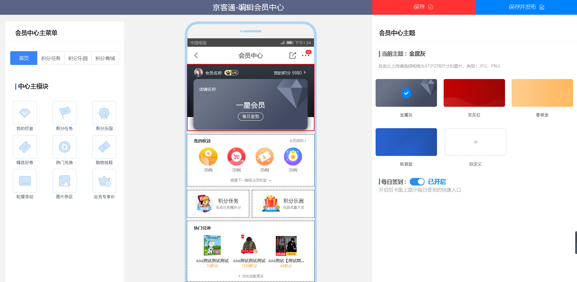 装修好会员中心后保存或保存并发布,将编辑模板命名后即可保存至草稿箱,同时可以扫描二维码体验装修页面,在确保无误后可直接投放宣传。