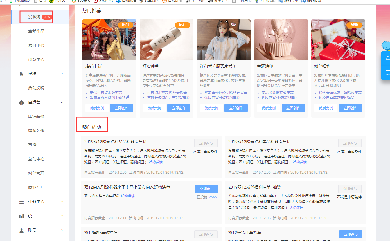 任务奖励:[双十二店铺上新招募]审核通过内容将会进入微淘上新频道,[双十二好货种草招募]获得微淘公域曝光和进入猜你喜欢。