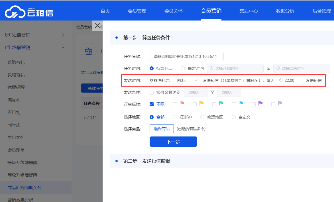 不同的商品会有不同的消耗周期,所以回购周期也不一样。云短信CRM的商品回购周期关怀可以对单个或多个商品同时进行关怀,能够准确提高商品的复购率!