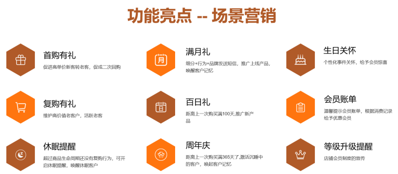 云短信CRM场景营销功能中包含了:首购有礼、复购有礼、休眠提醒、满月礼、百日礼、周年庆、生日关怀、会员账单、等级升级提醒、商品回购周期关怀等10个场景。能够针对不同阶段的客户进行相应的场景关怀,这种周期性、规律性的场景化营销,能大大提升客户对品牌的认知度,增强客户黏性,减少流失。