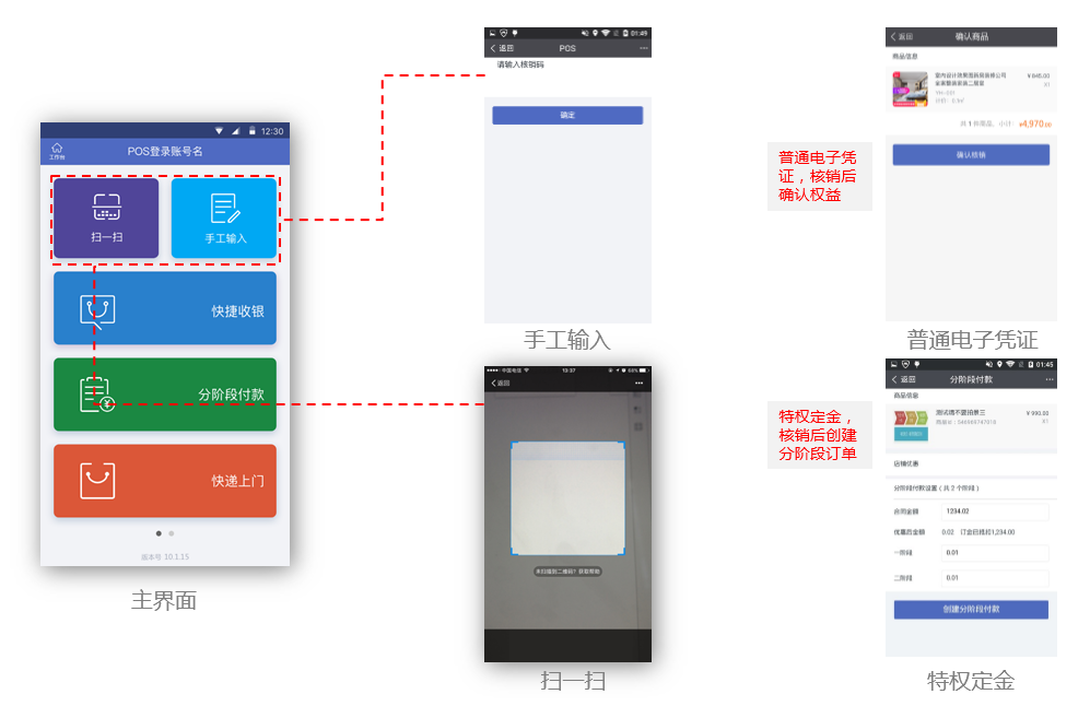 POS端支持普通电子凭证和特权定金电子凭证核销。顾客到店后,出示手机短信凭证号码 或 手淘中的电子凭证二维码,店员通过手工输入 或 扫一扫方式进行核销。