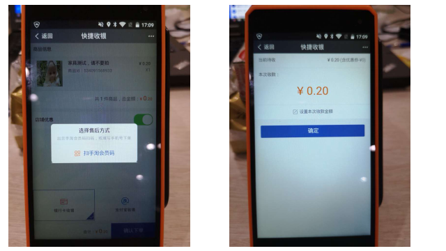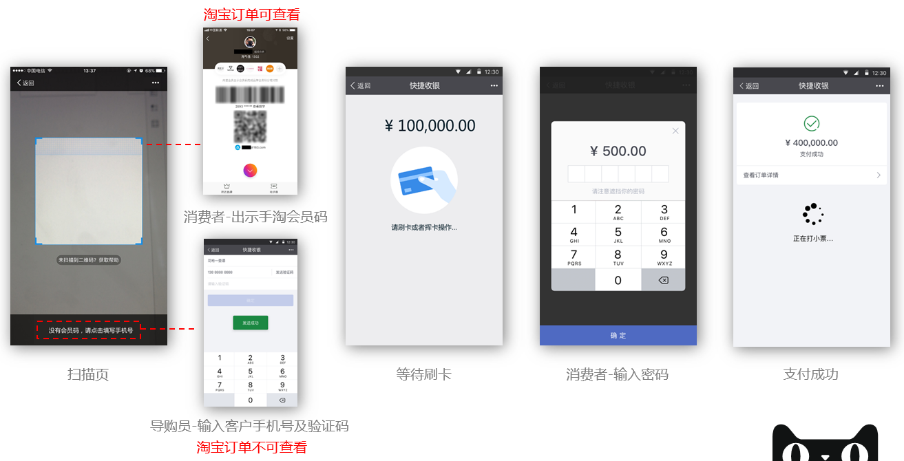 银行卡收银:需请消费者出示手淘会员码,此操作为了确定买家身份,并不会以此来付款,如消费者非手淘会员,可以通过填写消费者手机号进行快速注册。需要注意的是,快速注册交易订单在消费者的淘宝订单中不可见,之后开始刷卡流程,如下图