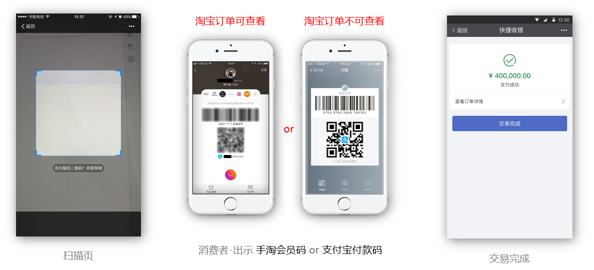 选择"支付宝收银"时,消费者出示"手淘会员码"和"支付宝付款码",收银员扫码顾客出示码,完成付款。