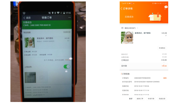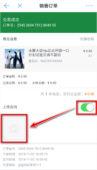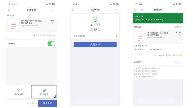 付款完成后,门店收银点击上传合同,将有效交易凭证拍照上传,可查看订单最新状态,消费者亦可在个人手淘端查看该订单
