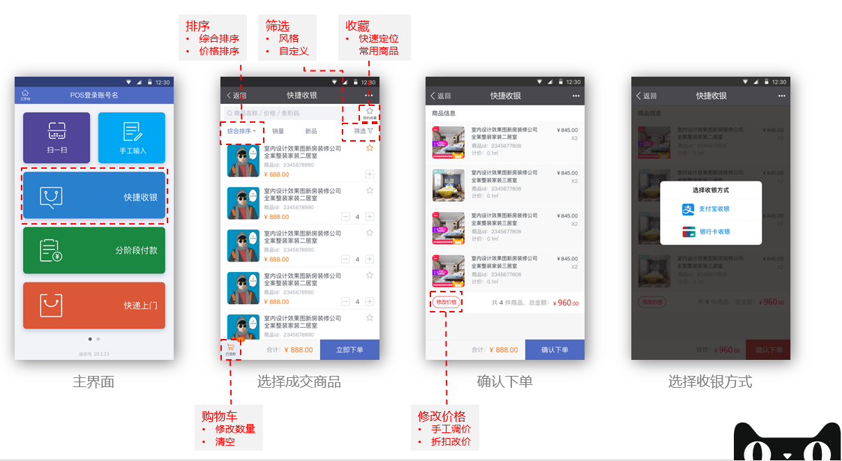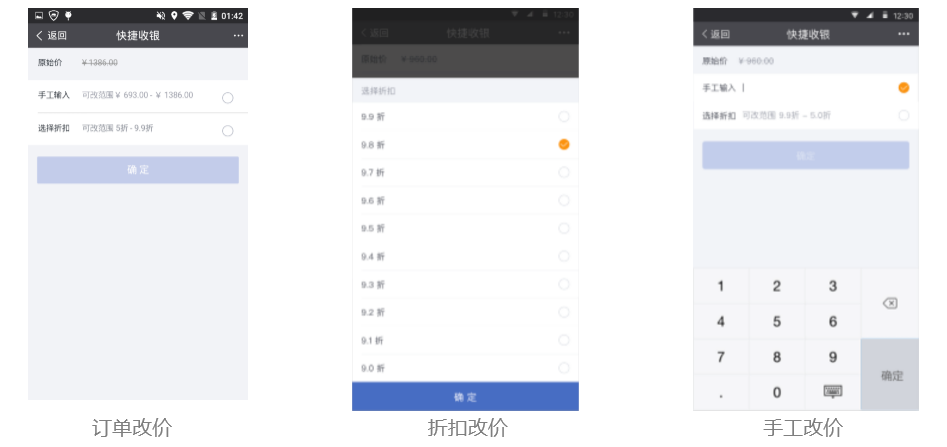 快捷收银即现场拿货。支持顾客同时购买多件商品和数量,批量下单付款。确认下单前,如门店有现场改价权限,可支持对下单商品的批量改价功能。具体见下图第三幅图。收银方式,支持"支付宝收银"和"银行卡收银"两种模式。