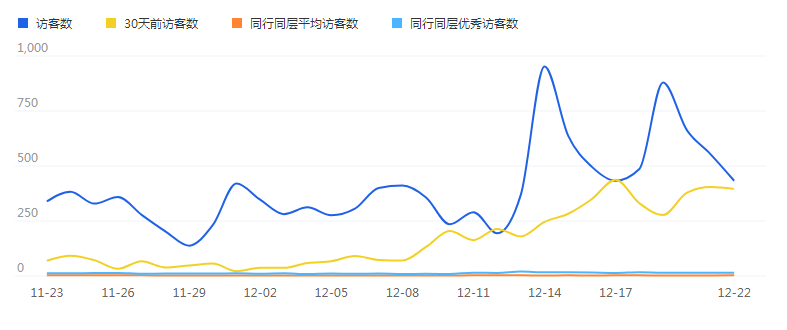 从黄色曲线可以看出,是一个明显的上涨趋势,带来访客比较大,蓝色曲线是近一个月月的访客,会受大促的影响访客会有波动,维持发布视频,会在大促后呈一个大幅度的上涨趋势。