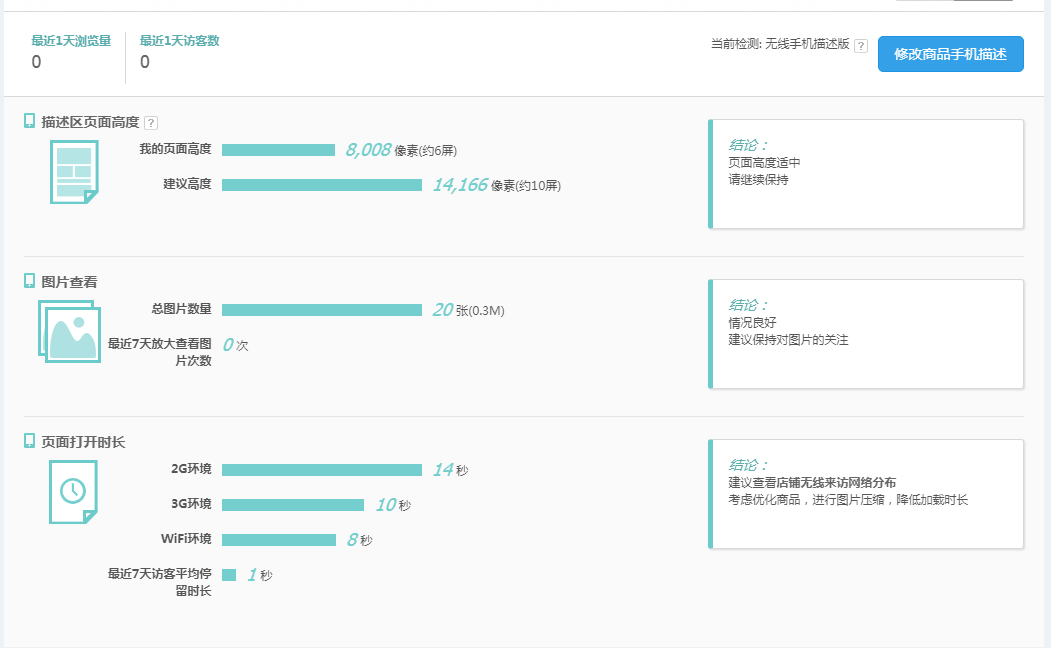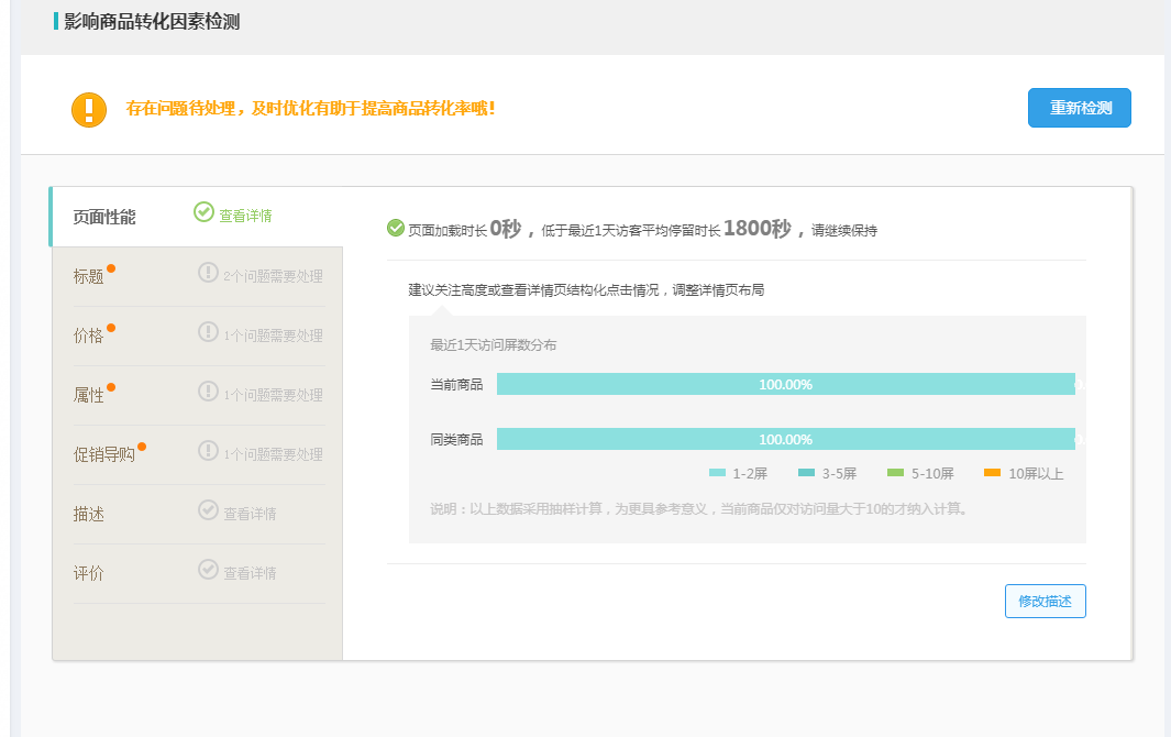 停留时间:详情页越吸引消费者那么停留时间越长,这可以说明消费者对你的内容十分感兴趣。希望能够多看你的详情页来斟酌,自己是否可以放心购买。店铺的宝贝停留时间在10-15秒。往往就是我们所说的转化率偏低的店铺。