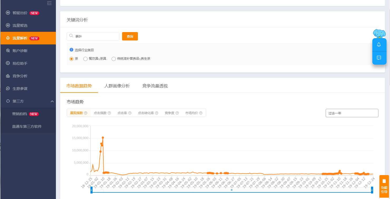 我们可以直接搜索行业类目大词,能看到一个关键词在过去一年的交易趋势,过去一年的展现指数、点击指数、点击率、点击转化率、市场均价、竞争度等信息。