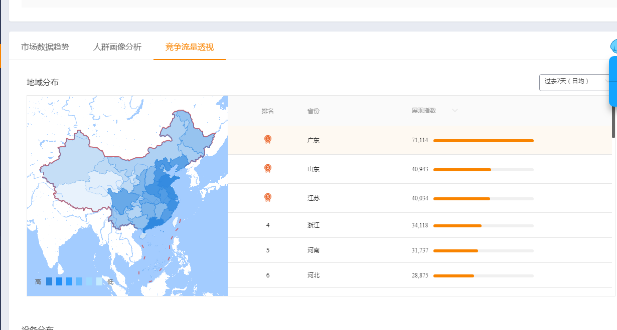 竞争流量透视功能:可以看到每个省份的流量转化点击数据、站内站外的数据对比、PC和无线的数据对比。对比点击率、对比转化率、对比展现量。