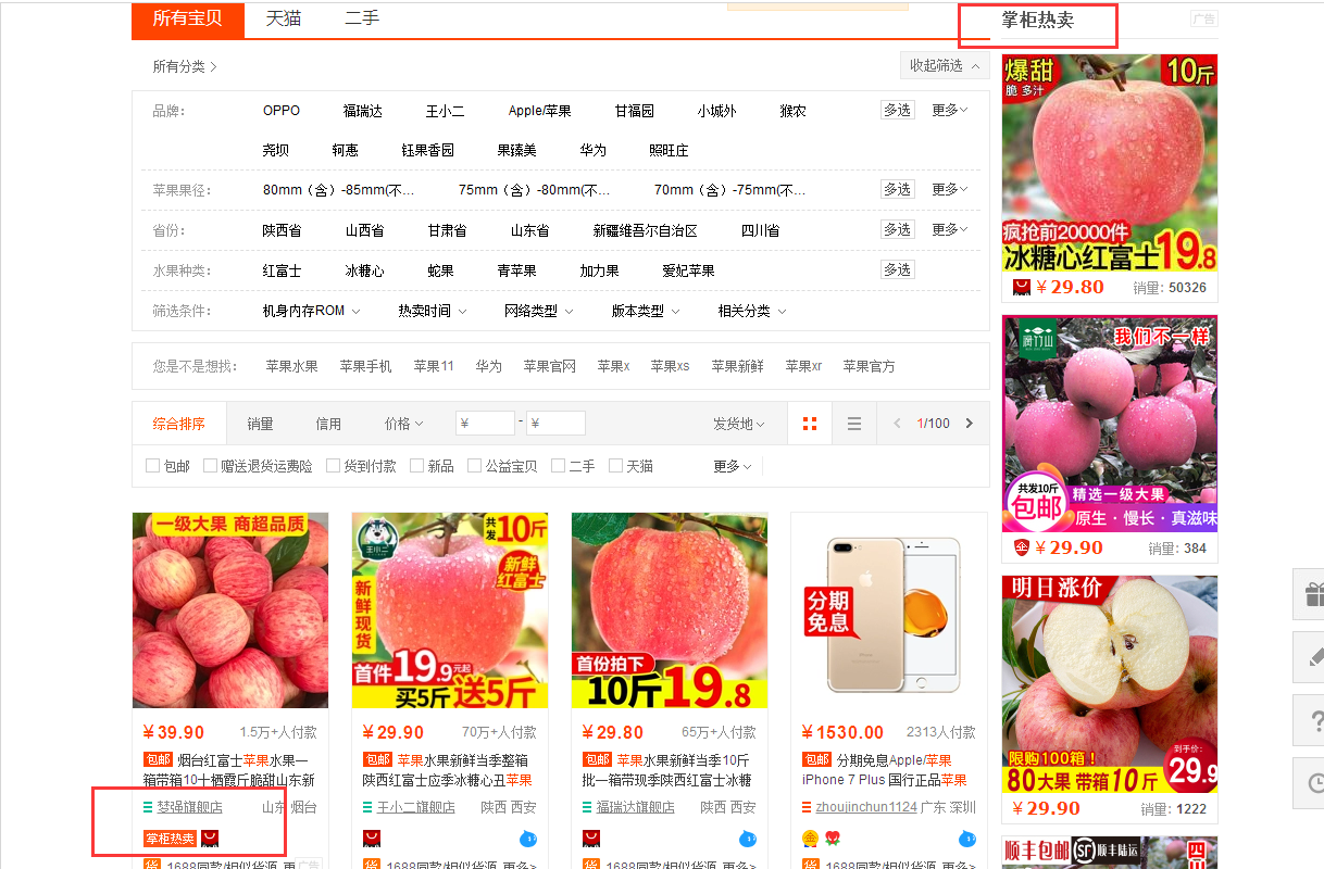 PC端:淘宝搜索关键词后页面左侧,有1-3位展示位,有提示“掌柜热卖”,页面右侧有16个竖着展示位,页面底端横着的5个展示位。每页展示21个宝贝,右侧展示1-16位,下面展示17-21位,搜索页面可一页一页往后翻,展示位以此类推。