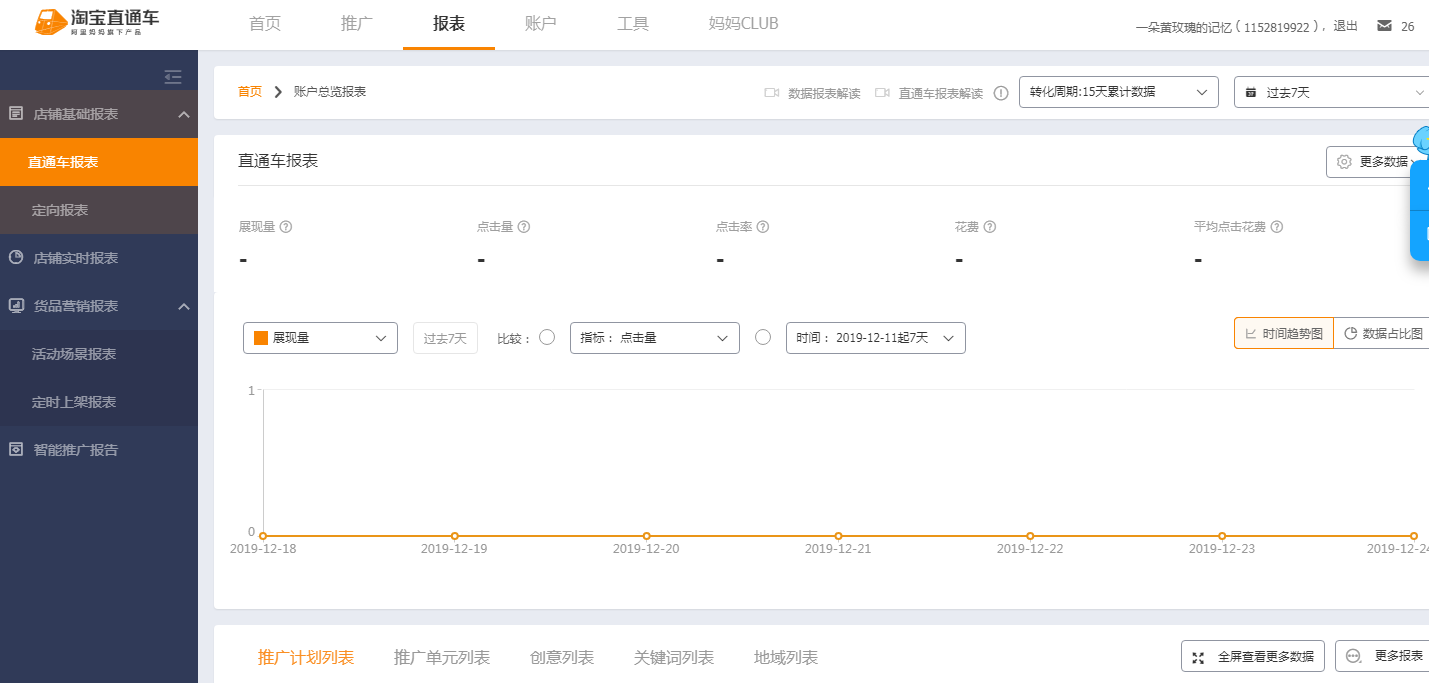 报表:可以看到整个直通车中展现量,点击量,点击率,花费的数据变化。往下面看可以看到不同的计划的数据显示,包括每天的分日数据。