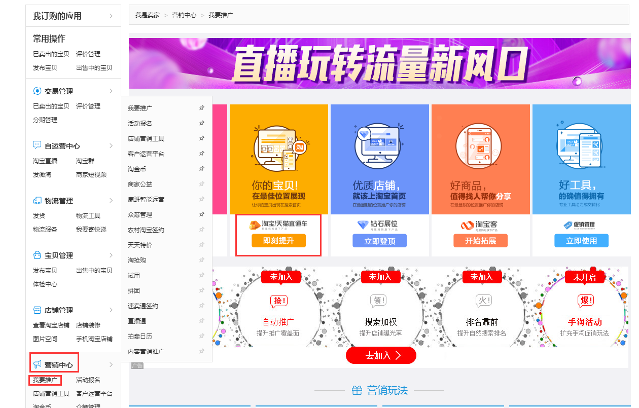 直通车的位置:卖家中心——营销中心——我要推广——直通车