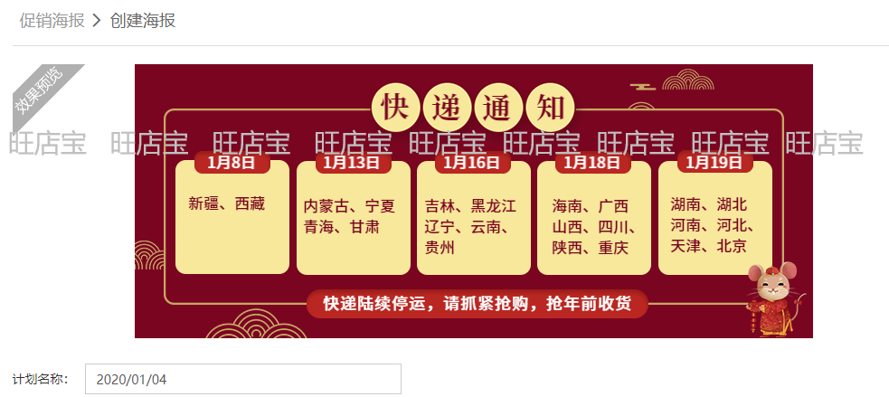 春节期间,很多物流公司或者减少运量,或者停运,首先要提前留意物流公司发出的通知,并制作春节发货海报在首页和详情页最为明显位置(旺旺的快捷回复也设置好关于快递问题的回复),说明什么时间只能发什么地方的快递,什么时间之后停止发件。这样不仅可以让买家了解停发货时间,及时进行购物,也可避免后续因发货问题而带来的售后问题,更能避免一些职业骗子利用淘宝规则进行诈骗行为。