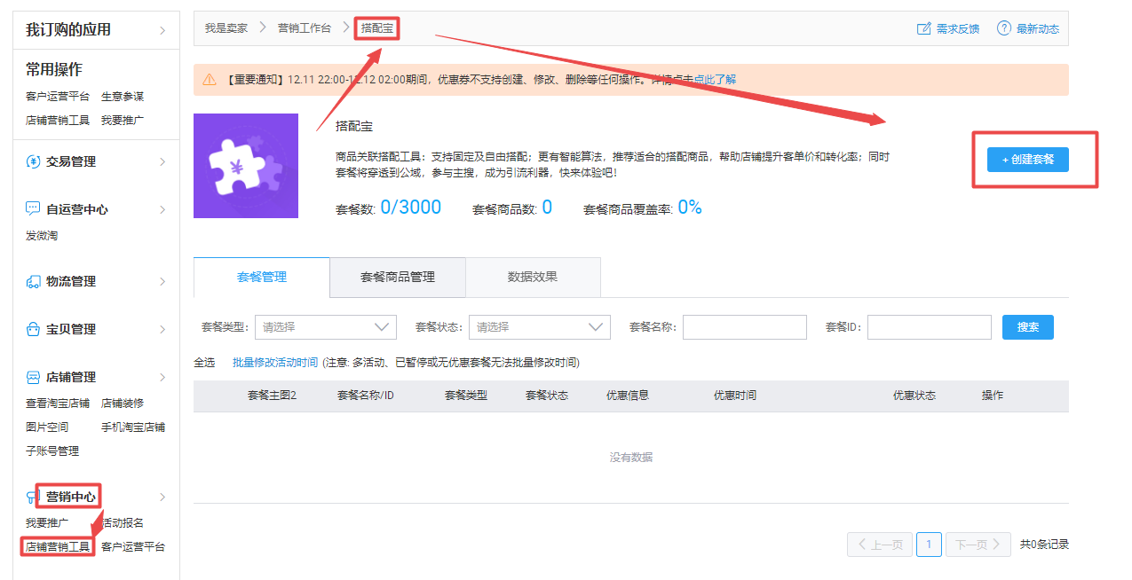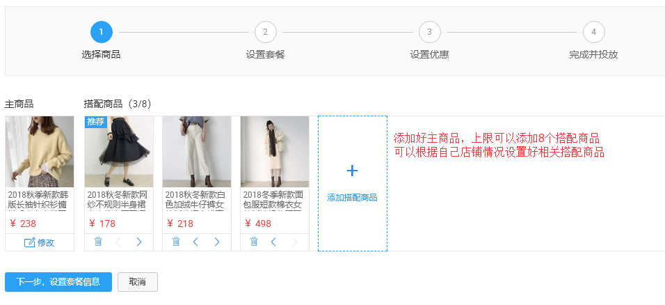 选择商品—设置套餐—根据产品利润情况设置好是否包邮,以及单品在搭配套餐的价格。