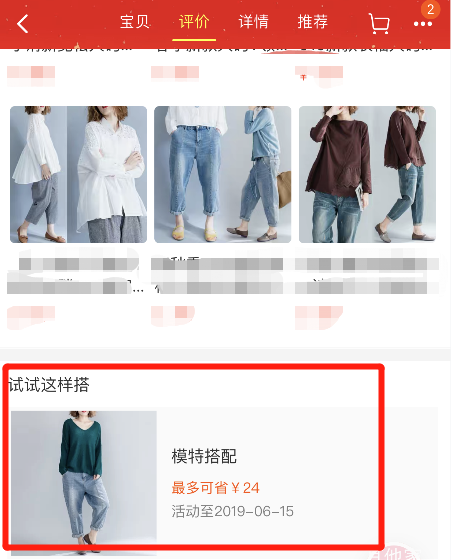 当买家点击进入模特搭配之后,可以看到这款单品搭配购买的降价幅度,当买家两件同时购买的时候可以直接提升客单价,这也是我们设置搭配推荐之后的实际效果。