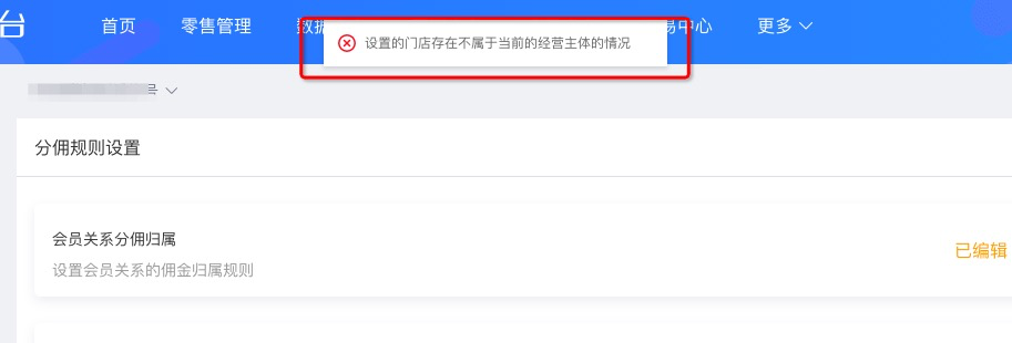 若出现如下错误提示,说明第三项设置选择参与分佣的导购范围时,选择的门店不是都在当前旗舰店下的门店,需要返回进行修改,再上线
