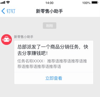 4、导购将会收到钉钉“新零售小助手”的任务通知,点击立即查看可以去执行任务