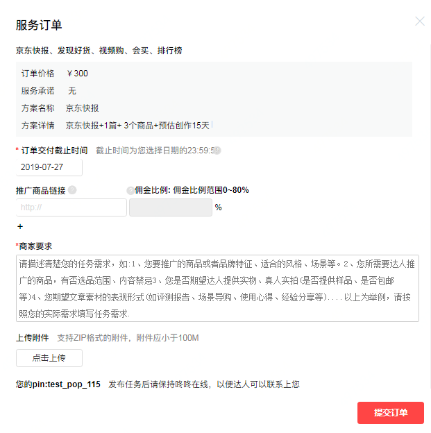认真查看服务订单详情、与交付时间(最晚T+90)。认真填写商品服务链接(与商家任务一致):提交商品个数:由达人侧配置方案时决定(最大20个),若商家填写的推广商品个数超过达人侧限制,则“+”置灰,红字提示:商品数量已超过达人限制点击提交订单:冻结相应金额;后续验收:点击后进入验收任务页, 并可通过该页面跳转至招商任务数据报表查看任务效果。