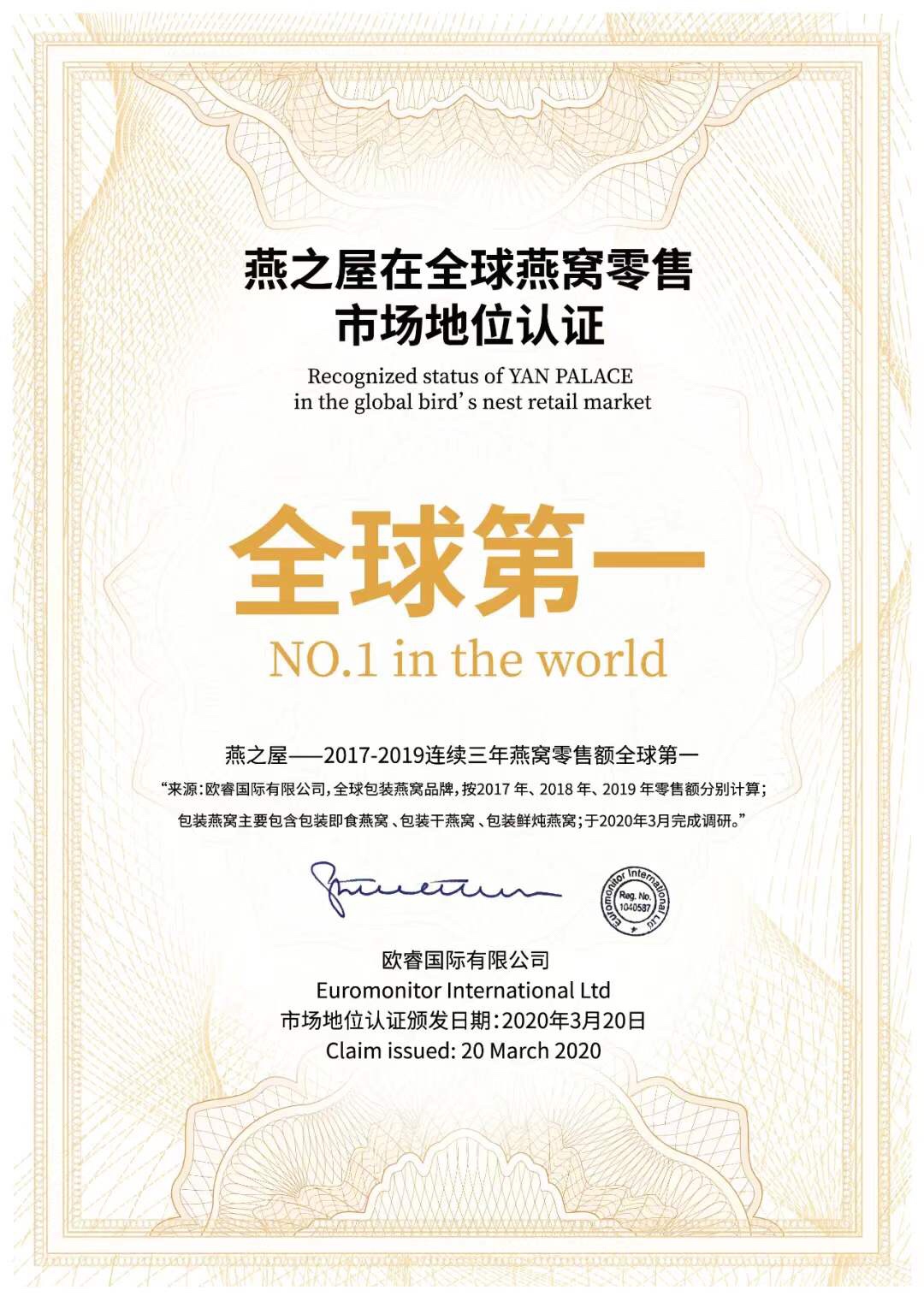 世界权威市场调查机构欧睿国际(Euromonitor International)近日为「燕之屋」颁布了“2017-2019连续3年燕窝零售额全球第一”和“2017-2019连续3年燕窝零售额全球领先”的双项权威认证。