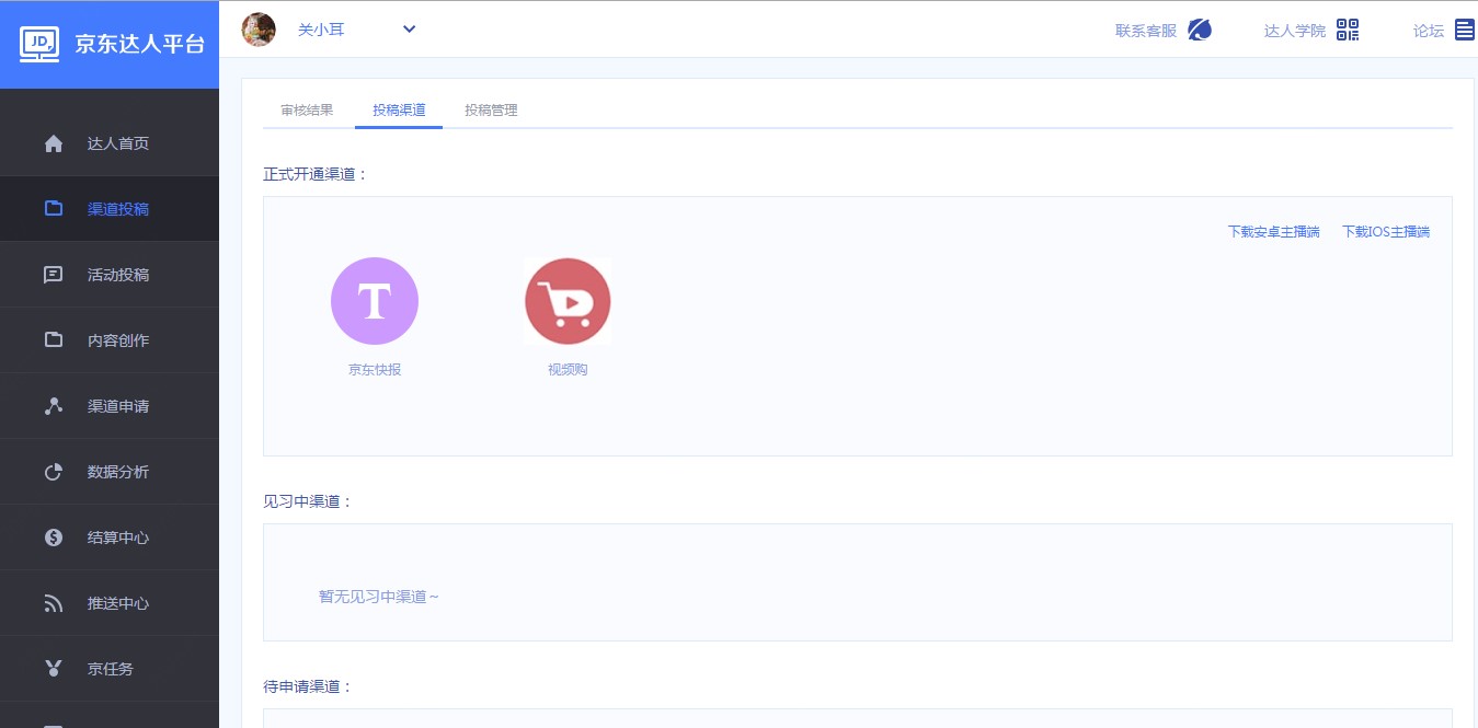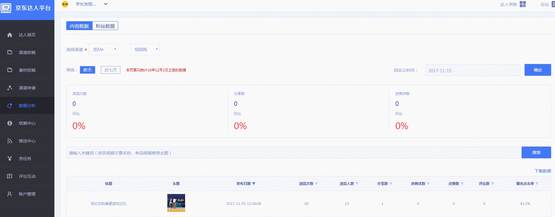 7、查看数据请进入京东达人平台-数据分析(选择渠道-视频购(短视频))。