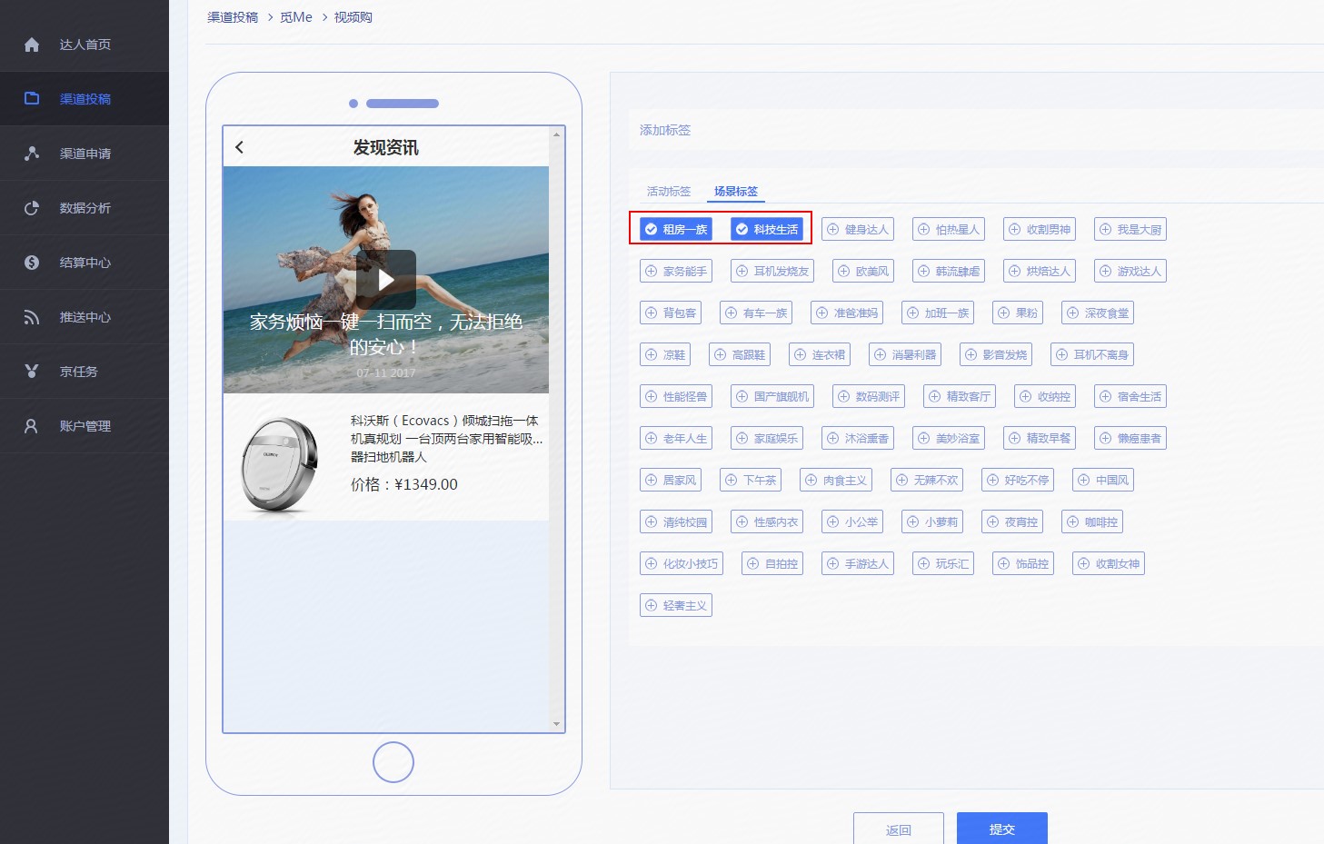 5、完成上一步预览后提交,进入如下界面 ,请选择对应的场景标签,并提交。