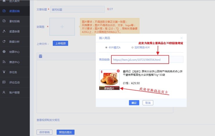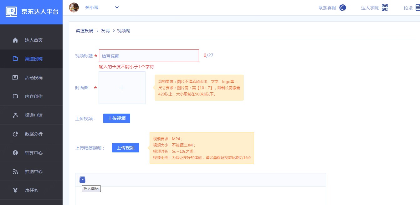 2、进入视频购(短视频)发布页面,仔细阅读发文规范,按要求填写各项信息:视频标题、封面图、上传视频文件、上传精简视频、编辑视频描述、插入商品页卡,当视频内容与商品强相关时,必须插入商品页卡,否则无需插入商品页卡。