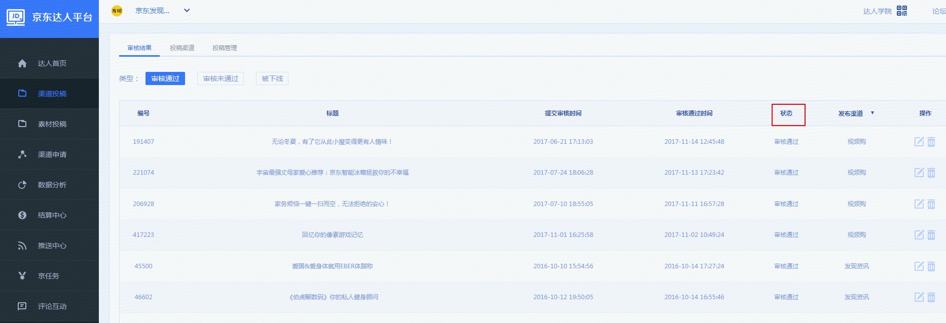 6、提交之后可在下图看到发文的审核状态,路径:渠道投稿-审核结果
