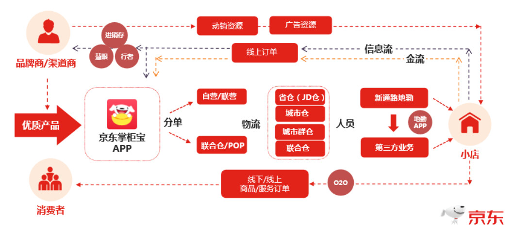 京东掌柜宝供货业务:解决品牌深度分销动销痛点,打通线上、线下,覆盖全渠道、多场景的B2B2C智能平台。