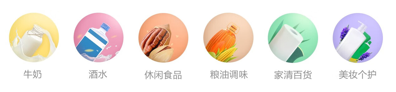 如休闲食品、粮油调味、方便食品、家清百货、美妆个护、母婴、小家电、文具、家纺内衣、计生用品、水饮牛奶、酒水等。