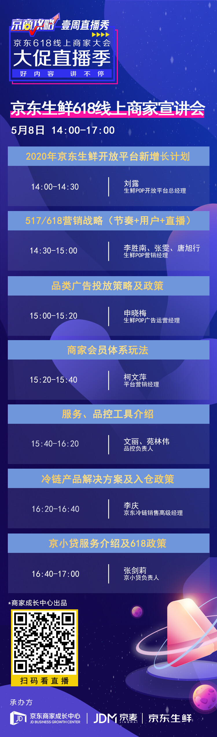 5月8日下午14:00-17:00,平台将召开【京东生鲜618线上战略商家大会】,包含官方2020品类战略及新增长计划,大促营销节奏、生态规则介绍,商家会员体系玩法,服务品控工具介绍,冷链产品及入仓方案介绍以及物流京小贷优惠政策等七大618大促内容。平台将与商家共赴战役,打响2020第一枪!
