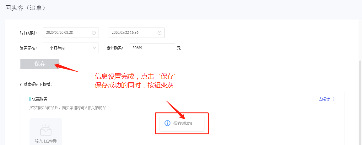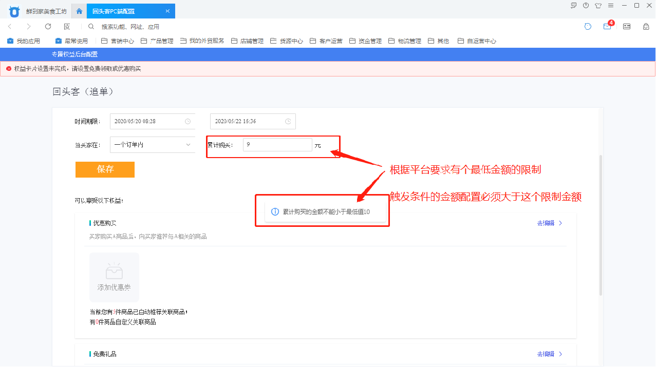 注意:‘累计购买金额’根据平台要求有个最低值,这个最低值的设定规则为10元(含10元)起;