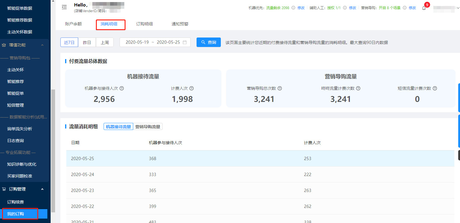 为了解决这些问题,我们新上线了【消耗明细】功能~在消耗明细中你可以查看到店铺机器接待流量、营销导购流量(咚咚和短信)的消耗情况,筛选方式支持近7日、昨日、上周(最大查询90日内数据)。