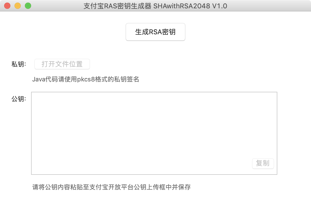 Windows 系统:https://os.alipayobjects.com/download/secret_key_tools_RSA256_win.zipMac 系统:https://os.alipayobjects.com/download/secret_key_tools_RSA256_macosx.zip密钥生成步骤